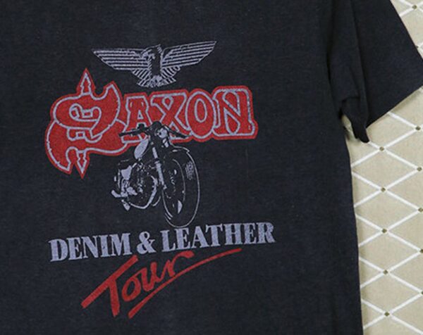 Step back in time with this vintage Saxon Tour T-Shirt from the 1980s, featuring iconic bands like Judas Priest, Iron Maiden, Motorhead, Scorpions, and more. Made from heavy metal material, this rare black shirt is a must-have for any true rock fan. Stand out from the crowd and rock on with this unique piece of music history.